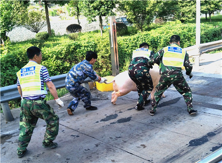 面對突發(fā)的緊急情況,駕駛員一時束手無策,當(dāng)班副班長立即向值班領(lǐng)導(dǎo)匯報,請求增援。為了防止這頭豬給過往車輛造成安全通行威脅,收費所工作人員及時關(guān)閉了7號車道,此時的“二師兄”不讓人靠近,大家只好形成一個包圍圈,不讓它竄到其他車道去。幾分鐘后,增援的高速執(zhí)勤隊員趕到現(xiàn)場,大家七手八腳,終于將這頭豬扛著,送回到了小貨車上。執(zhí)勤隊員說,這輛車上的一頭豬剛剛還在黃土嶺隧道內(nèi)跳出來一次。