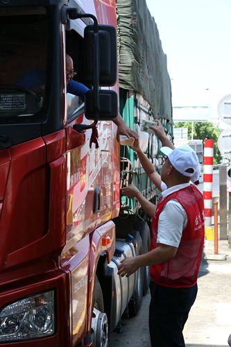 圖為志愿者給過往司機遞上清涼飲品