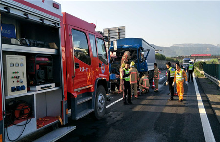 控制好現場以后,消防人員利用擴張器展開救援,但是成效并不明顯。7點左右,救護車已然到達現場,但是駕駛員依舊卡在車中。為保障駕駛員生命安全,消防人員并未進行強行拆除,而是召喚了一輛帶有氣泵設備的專業消防車趕往現場,利用氣泵剪進行破拆,經過眾人的努力,終于將臉上鮮血直流的駕駛員成功救出,并送上救護車。7點30分,救護車與消防人員撤離現場,施救中心人員進行善后工作,并將事故車輛拖離現場。8時許,高速恢復通行。