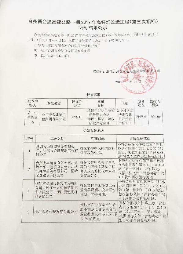 臺州甬臺溫高速公路一期2017年高桿燈改造工程(第三次招標)評標結果公示